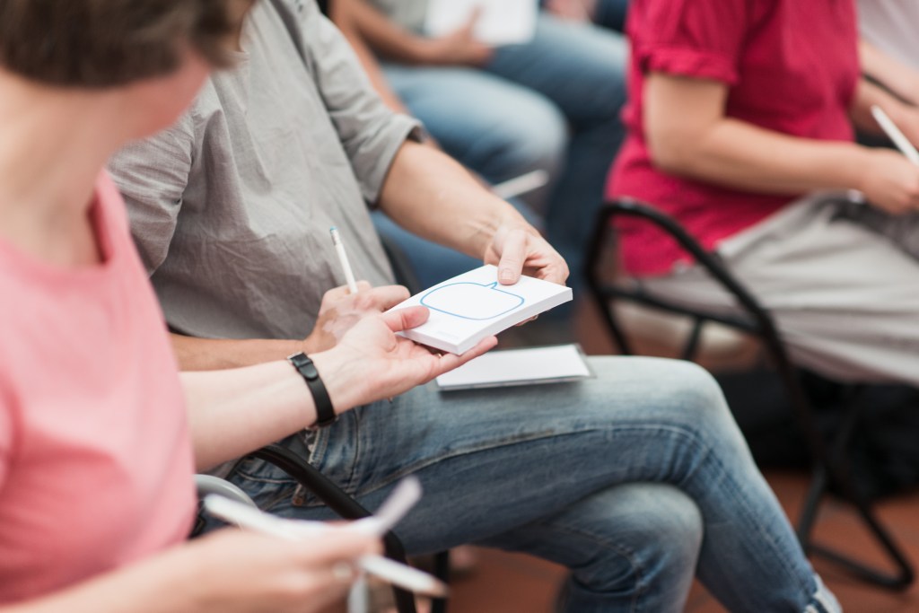 Als nächstes soll auf jeden Strich ein Wort geschrieben werden, beginnend mit dem jeweiligen Buchstaben. Alle Wörter sind erlaubt, egal ob Verb, Substantiv, Adjektiv oder Fantasiewort. Dann werden reihum Reihen zu einzelnen Buchstaben vorgelesen. Das Werk wird sehr unterschiedlich wahrgenommen: Azurblau, Aqua, anstrengend, akribisch lauten Worte aus der Reihe „A“, Energie, einfallslos, einfach, echt, eigen zu „E“ und Mediation, Meer, Mut und mehrdeutig zu „M“. Während die Wörter vorgelesen werden sieht man das Werk von Yves Klein auf einmal aus vielen verschiedenen Blickwinkeln. Einige Wörter wiederholen sich oft, wie „Blau“ oder „Meer“. Manche stehen in starkem Kontrast zueinander, wie „leer“ und „dynamisch“. Durch die Übung wird deutlich, wie stark wir selbst Kunst mitbestimmen – unsere Tagesform, unsere Sicht auf die Dinge, unsere Erwartungen, Erfahrungen und Hoffnungen formen den Blick auf das Werk, es wird zu einer Projektionsfläche, die wir selbst wesentlich mitgestalten.